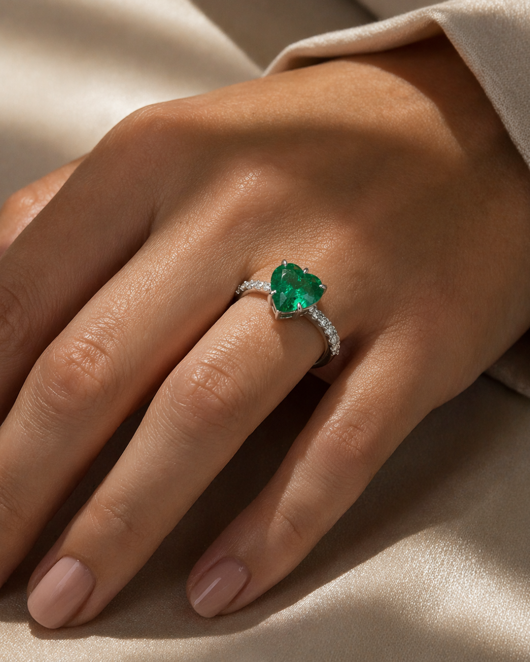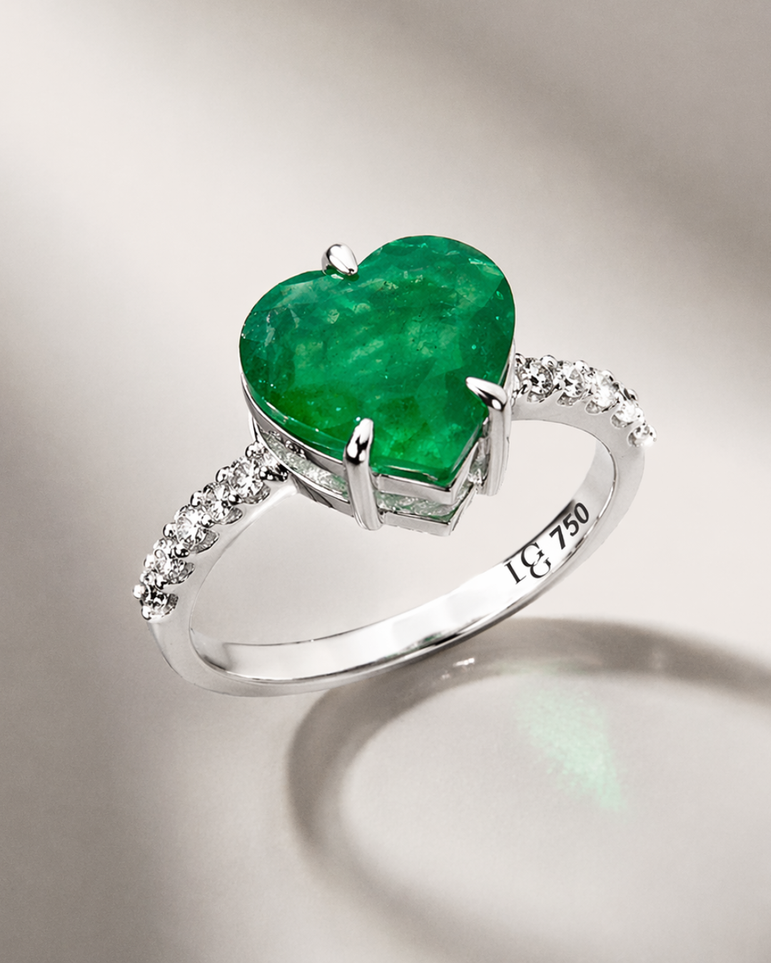Some jewels are not just accessories. They mark stories. The Angelina Ring was created to celebrate moments that deserve to be remembered with a natural emerald in a heart shape that symbolizes love, intensity, and sophistication.